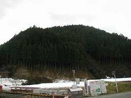 | 北側の県道12号線から見た大岩城。比高70mほどの山上である。山城らしく、周囲は天然の切岸といっていいくらい切り立った山である。 | 1郭下の帯曲輪。犬走りていどのものである。この手前に竪堀2がある。 |