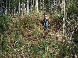 | 堀切1を降りるウモレンジャー隊員。深さ5mほどである。 | 堀切2。深さ3mほどで、これが城域の末端を示していたようだ。 |