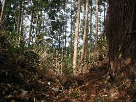 | Aの登り口。車は通ることがないというので、ここに車を留めさせていただいて上まで歩いていった。ここからの比高は80mほどであろうか。尾根をぐるりと回りこむ道で、傾斜が緩やかなので、かなり遠回りになるが、ぜんぜんきつくない道である。 | 左の道をずっと歩いていると、見通しが利かない山林のためにいつしか、城址を通り過ぎてしまう。この写真のような土橋状になる部分(右手は杉林)まで来たら完全に行き過ぎである。よく見ると背後の木の合間に高館山らしいものがなんとなく見えるので、それを目指して引き返さねばならない。 |