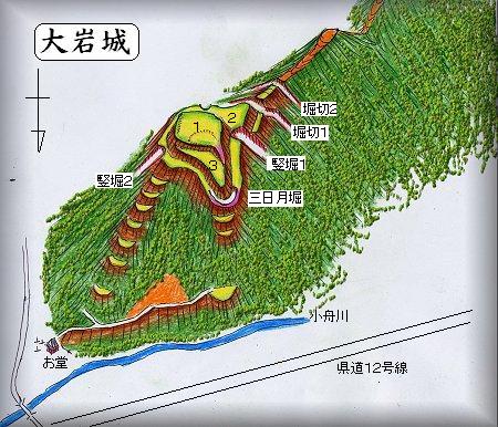 大岩城は基本的には単郭と腰曲輪だけの単純な砦といった趣の城である。規模もたいして大きくないが、堀切、竪堀などの基本構造をしっかりと押さえた上に三日月堀まである。戦国期につなぎのとりでとして用いられてきた城であろう。比高70mほどだが、天然の切岸のような山で登るのにはかなり骨が折れる。特に茨がたくさん生えているので、あちこち傷だらけになってしまうのがつらい。