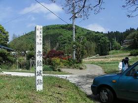 | 川を挟んで西側から見た高館山。川面からの比高は130mほどある。 | 県道163号線脇にある城址標柱。ここから一番上の民家まで車で進むことができる。(ただし道はかなり狭い) |