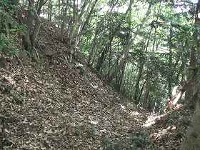| 2段堀切になっている南側の堀切3。深さは北側で3mほど。 | 2段堀切北側(城内側)の堀切2。深さは6mほどあり、壁面は岩盤が露出するほどの切岸となっていて、現在でもよじ登るのが大変なほどである。 |