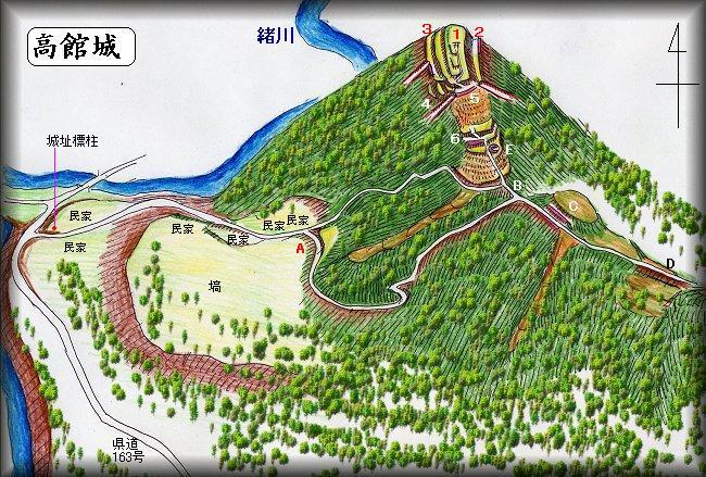 県道163号線で北側から来ると、「野沢口」の橋を過ぎてすぐに台地上に上がる道があるのが分かる。よく見るとその脇には「高館城」の城址標柱も立っている。これが城址の入口である。この道を一番上の民家まで上がると、右側に登っていく道(A)が見える。これ以上車ではいけないので、そこに車を留めておくのがよいだろう。現地で伺った際にもこの道を行くことを勧められた。「かなり荒れているよ」と言われたのだが、実際にはけっこうちゃんとした山道で、何の問題もなかった。ただし、道の両脇は木が生い茂っているので、周囲を見渡すことがほとんどできない。城址に入るためには途中から山頂の方に向かわなければならないのだが、この入り口がちょっと分からない。実際、どんどん上がっていくと、峠らしき所まで来たが遺構がない。途中、Cの辺りで切り通しの道が横堀状に見えるところがあって「ここかな」と思ったのだが、そうでもないようだった。「こんなに遠くに見えなかったはずだが・・・・」などと思いながら進んでいくと道が土橋状(D)になっていく。さらに進むと今度は道が降り始めた。ここまできてはっきりと行き過ぎてしまったことに気が付いた。「城はどこだったのか」と思って振り返ってみると後方の木の合間から、高館山らしきものが見えていた。「城はあそこか!」と思って、今度はかすかに見えるその山の位置をイメージしながら戻ることにした。