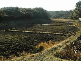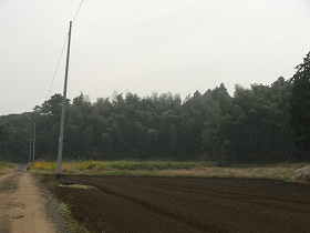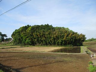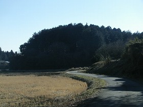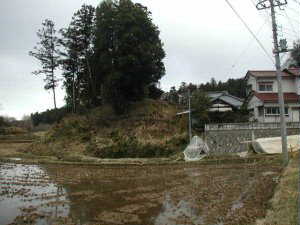 | 西側下から館跡を見たところ。下の水田は、もとは天然の堀であったものだろう。 | 南側の突端部。中根山城の真下から見たところである。 |