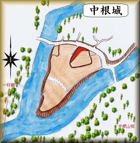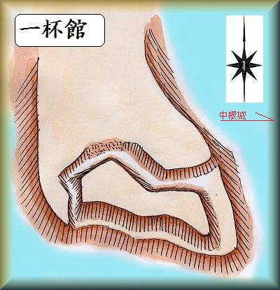 一杯館は、谷戸部分を挟んで、中根城の西側に位置している。比高15mほどの台地の先端部を加工したものである。中根城の外縁部に辺り、前面を守備する出城のようなものであったろう。あるいは、中根城から西側にはこの台地があるために眺望が利いていないので、物見のための施設だったのかもしれない。