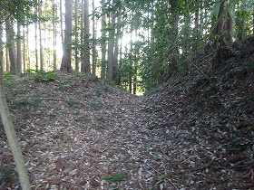 | 1郭北西側の堀と土塁。堀底は下に回りこんで腰曲輪を形成している。 | 1郭北東部の虎口。 |