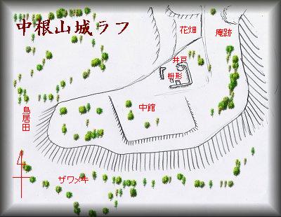 「小川町史」の古図を見ると、単純な単郭で、台地基部を土塁と堀で区画しているように見える。「かなり大きな土塁が見られる」ともあったのだが、それらしい明確なものはない。たまたま山中で地元の方に出会ったので中根山城のことを伺ってみたところ、「確かにこの山の先端辺りに城があったという。この部分は中ダテ山(中館山)と呼んでいる。しかし、植林などでだいぶいじられてしまっているので、現在では遺構のようなものはない」ということであった。