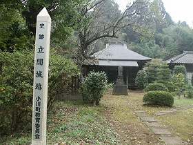 立開城は、県道145号線の西側、教信寺の敷地内にあった。県道沿いに教信寺の入口の案内があるのでそれに従って入っていけばよい。参道を行くと右手に城塁の土手が見える。参道は右に曲がり、石段を上がると、下の写真の標柱のある境内に達する。この石段の部分は虎口のようにも見えるのだが、東側の端にも道がついているので、あるいはこちらは後世の所産に過ぎない可能性もある。