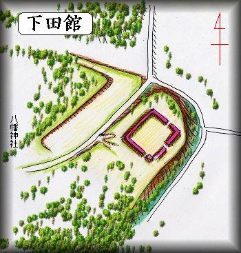下田館の場所は分かりにくいが、中延の八幡神社の東側の、台地の突端部辺りである。構造は単純な方形で、方40mほどの区画で土塁が巡らされているが、堀は掘られていない。土塁の高さは1.5m程度のものでそれほど防御性に富んだものとはいえない。また北東部辺りでは、郭内の方が深くなっている部分もある。「枡形山」という名称は、この方形の土塁にちなんでいるものであろうと思われる。