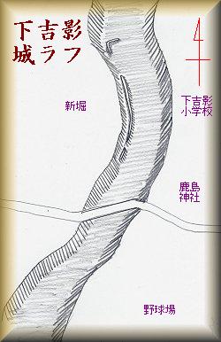 下吉影城は、下吉影小学校の南西300mほどの所にあった。南北150mほどに渡って、上端幅8m、深さ2,3mの空堀が残っているという。
