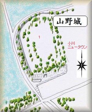 山野城は、小川ニュータウンの西のはずれにある。小川ニュータウンと、西側の東宝ランド住宅街との間には幅100mほどの水田地帯がある。この小川ニュータウン側の、比高10mほどの北西側に突き出した台地先端部が城址らしい。北側に突き出した半島状の地形である。