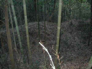 この櫓台の奥が3郭、堀はこの右手にずっと続いている。この先の左手に長く延びた土塁があり、4郭もあるが、4郭はあまりきちんと造成されていないらしく、堀や土塁も浅くなっている。また、この郭には溝の跡のような、浅い窪みが縦横に走っている。しかし、藪がひどくて正確な形状は確認できない。