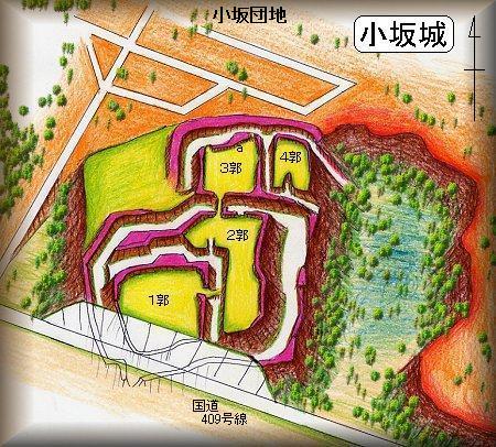 小坂城は、国道408号線の「第12東宝ランド入口」」と「上小坂」のバス停の間辺りの北側の比高20mほどの、愛宕山と呼ばれている台地上にあった。小坂団地のすぐ東南である。台地の先端は国道によって一部削られている観がある。歴史等詳細は不明だが、昭和54年、国道の改修工事に伴い、事前調査が実施された。それによると城の規模は南北150m東西120mあり、本丸、二の丸、三の丸が良く保存されているという。各郭の周囲には深さ2m幅3mの空堀があり、内側には高さ2mの土塁がある。土塁の法面には柵が存在していた跡と見られる直径10〜15cmの柱石群も確認されたという。しかし、現在では山林化してしまっているようである。(以前の記述)