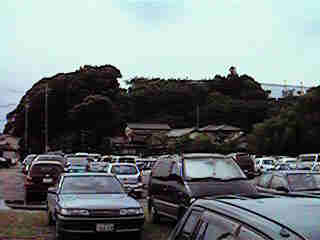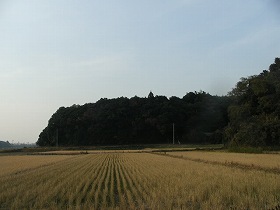 | 東側の県道近くから見た羽原城。比高15mほどの台地に展開している。写真は先端の1の郭の辺りである。 | 1の郭入口の虎口。 |