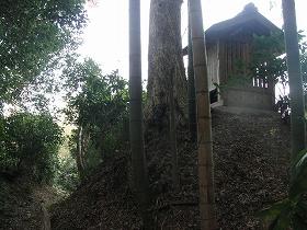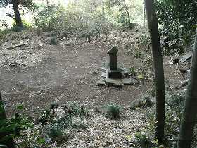 | 3の東南側城ノ内の堀と土塁。しかしそれほど明瞭な遺構ではない。 | 4の土壇の上には何かの祠が祭られている。この辺りにも堀があったのであろうか。 |
