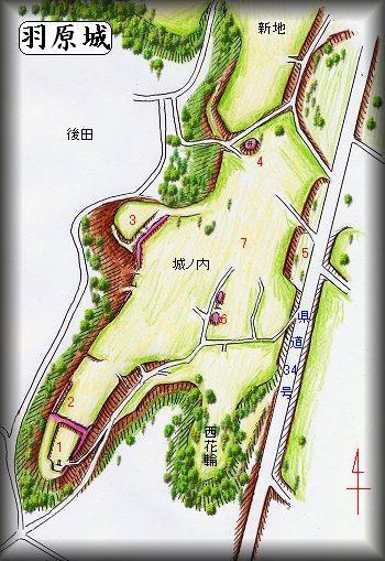 | (以前の記述)県道34号線のすぐ西側、羽原町の公民館から南西には行っていった辺りに南に延びる比高10mほどの台地が2本あるが、これが羽原城の跡である。泰成所という工場の西200m、東洋運搬機という工場の北500mの位置である。 台地上は竹藪などになっているが、所々に民家が建っている。台地の真ん中あたりから、民家に上がっていく道があるが、そこを行くと土塁と虎口が見えてくる。土塁は何かの塚を利用したものらしくて、その上に祠が祭られている。そのまま土塁は南の方に延びている。また土塁の外側には井戸の跡らしきものがはっきりと残っている。城址はこの辺りから台地先端部に続いているようだが、藪になっているので、今回はここまで。概念図によると、空堀や土橋なども残っているようであるが、はっきりとは確認できなかった。歴史等についても未詳。 |