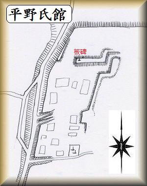 平野氏館は、県道209号線の「北方中央」の交差点から南に坂を上がったところの東側の台地上にある。この道そのものが、空堀の跡でもあろう。すぐ脇に館の土手が聳えている。
