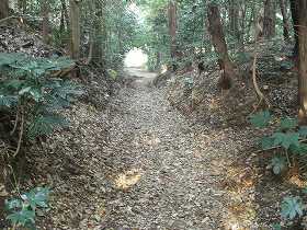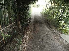 | (以前の記述)馴馬城は南北朝時代の城である。北畠親房は、関東地方で南朝方の活動を支援していたが、康永2年(1343)、関城や大宝城が落城してしまうと、後事を春日顕国に託し、吉野へ帰ってしまった。春日顕国は、この馴馬城に籠もって旗揚げしたが、幕府側の宍戸朝里らに攻められ落城、顕国も殺された。 馴馬城は比高7,8mの低い台地上にある。県指定の史跡となっているのだが、遺構のほとんどは山林化している。が、山道を辿ってみると、虎口や空堀、土塁などを確認することができる。殊に、連郭式の二、三郭の北側にある堀の跡は深さは5mほどしかないが、幅20m以上と格段の広さを持っている。この時代の城の台地上の堀としては常識外のものである。写真の右側の道が土橋で、堀はこの左右に広がっている。かつてはここには水がたたえられていたことだろう。 城址の標柱もかつてはあったらしいが、朽ち果ててしまったのか、現在では見あたらなくなってしまっている。 |