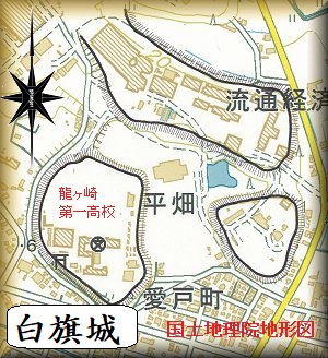 白幡城は現在の龍ヶ崎第一高校のある、比高20mほどの奈戸岡と呼ばれる台地上にあったという。龍ヶ崎氏はこの地に居城を構え、600m東南の龍ヶ崎城に出城を構えたといわれる。