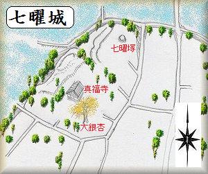 | (以前の記述)七曜というのは変わった名だが、かつてこの地には7つの塚があり(大塚町というのもそれによるものか)それを星座にちなんで七曜と呼んだことによるものだという。国道408号線の「辺田」というバス停の辺りから、県道68号線に曲がって南下する。小野川橋を渡るとそこらあたりが大塚の集落になるが、その辺りの細い道を西に300mほど入っていったところに大銀杏が目立つ真福寺という寺院がある。この裏手の竹藪あたりが城址らしい。竹藪の中には土塁らしき高まりも見えるが、城址遺構なのかどうかははっきり分からない。平地の居館と言った趣である。土豪の館なのであろうか。歴史など詳細は不明。 | |