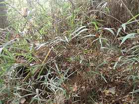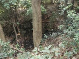 | 図の堀とある部分の脇の土橋。しかし遺構の規模がここだけ大きすぎ、遺構と見てよいかどうか疑問である。 | 左の土橋から続いている堀切。1郭の東側の部分である。 |