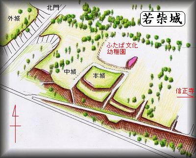 | (以前の記述)「関八州古戦録」巻14には「多賀谷重経、小張、足高両城を攻め落とすこと」という項があるが、この時に多賀谷氏に協力した武将として、小金城の高城、布川城の豊島、牛久の尾上らと並んで、若柴の若柴民部少輔という者の名が挙げられている。どういう人物であったのかよく分からないが、これが若柴城の城主であろう。岡見氏や土岐氏が抗争を繰り広げてきたこの地で若柴氏がどのように立ち回ってきたか明らかではないが、その時には多賀谷氏に属していたらしい。しかし岡見氏の系図によると、岡見頼忠という者が若柴城の城主であったとある。もともと岡見氏の持ち城だったものが、多賀谷氏に落とされて、多賀谷方の城となったということなのだろうか。 若柴城は、佐貫駅の北1.2km、「若柴町」という信号から南に曲がった辺りの比高15mほどの台地上にあった。現在この地には、信正寺という真新しい寺院が建立されている。この寺院についてはよく知らないが、新しく立派な山門や本堂をどんどん建立していることから、そうとうの財力のある寺らしいと言うことだけは分かる。しかし、これだけの建物を建てたからには、遺構のかなりの部分が失われてしまっているのかもしれない。 『龍ヶ崎の中世城館跡』の概念図によると、若柴城は四郭ほどを連郭式に並べた縄張りをしていたらしい。本城、中城、外城といった字名が残されているらしい。ふたば幼稚園との間の畑の辺りには幾分遺構があるらしいのだが、はっきりとは確認できなかった。地元の人に聞いても「城のことは聞いたことがない」と言われてしまった。 |