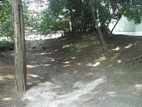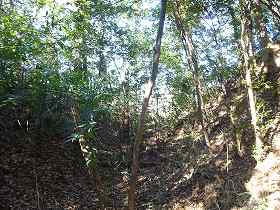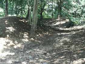 | 神社参道左側の堀跡。現状では深さ2m、幅8mほどである。本来はもっと深かったであろう。 | 参道の右手の堀と土塁。土塁はこの先の部分が最も高くなっている。 |