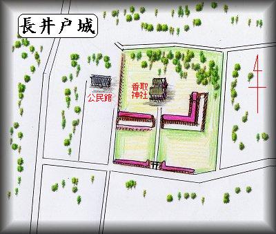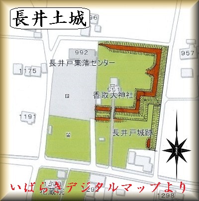 長井戸の香取神社が城址である。といっても残存状況はそれほどよくはない。鳥居をくぐって神社の参道を歩いていくと、本殿の少し手前の両側に堀と土塁があるのがはっきり分かる。虎口の右側の脇には「長井戸城址」という案内板もある。
