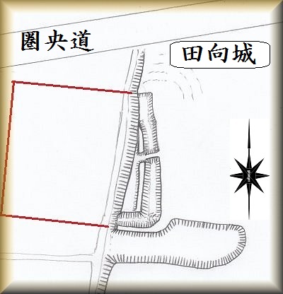 田向城は、比高6mほどの台地の縁部に築かれていた。すぐ北側を圏央道が通っているが、城はそのすぐ南側であり、幸い遺構は破壊をまぬかれている。まがりなりにも一部の遺構は残存しているのであるが、なぜか遺跡登録はされておらず、『茨城県遺跡地図』にも掲載されていない。