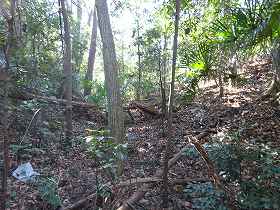 | 南側の横堀跡。堀の外側は土塁となっている。 | 東側の虎口。土橋と接続している。 |