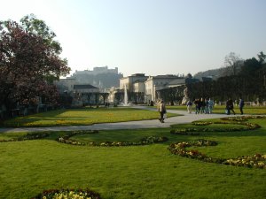 左の写真は、ミラベル庭園から、遠くザルツブルク城を見たところ。「サウンドオブミュージック」でマリヤや子供たちがドレミの歌を歌いながら公園を走り回るシーンがあるが、それらが撮影されたのがこのミラベル庭園である。公園を歩いていると、なるほど映画で見たことがあるような場所がいくつも見受けられる。