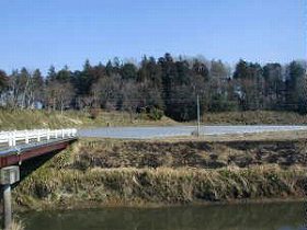 駒寄城は、西仁連川をはさんで、猿島町役場と東南に向かい合う辺りの位置にある。役場の東南200m(県道135号線沿い)に信号があるが、このすぐ南に、川を渡る橋がある。そのすぐ先に見える下の写真の台地が城址である。