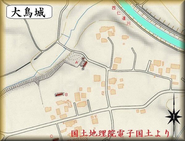 | 大鳥城のあった辺り。 | Aの土塁と堀跡。 |