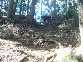 | 台地先端部にある神社。 | 神社の参道はこのように土塁状になっている。 |
