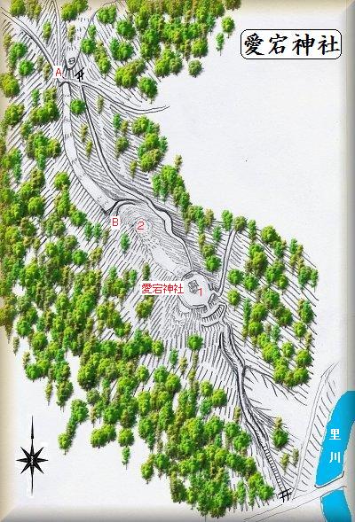 | (以前の記述)十殿坂館は国道349号線と県道36号線が交差する「里美橋」バス停のすぐ東南に聳えている比高70m近くありそうな山の上にあった。里川に望む急峻な山であるが、里美村にはこういうロケーションの古城址が多い。 山の上までは行けなかったが、北側の下に白羽神社がある。この奥の山が城址である。 また、その北側の山の中腹には愛宕神社がある。この愛宕神社まではとても急峻な石段が続く。年輩の人や子供にはかなり危険な石段だ。神社の入口は写真のように虎口状になっており、周囲の斜面も切岸のように切り立っている。しかし、神社のある面積は極めて狭く、家一軒建ちそうにない。ここは郭とするには少し狭すぎるようだ。周囲の急斜面も自然地形によるものであろう。 山頂には館跡の平坦地があり、また中腹にかけて何段かの腰曲輪と堀切が見られるということである。城主等は未詳だが、戦国時代、現里美村の小里一帯が岩城氏の支配となった頃には、この辺りが佐竹氏の最前線であった。境目の城であり、見張りのための砦といった側面もあったろう。 |