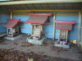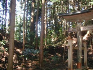 1郭の東南側角には何かの祠が祭られている。館の祭神が現在でも残っているのであろうか。1郭の東側も3mほどの城塁になっており、尾根続きのこちら側下にはk、堀跡のような部分も見られる。