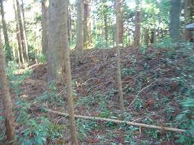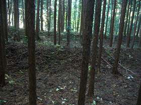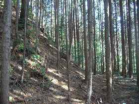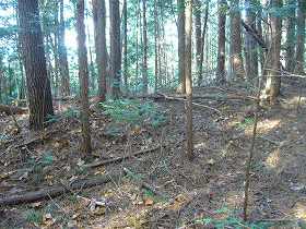 | 神社背後の土塁。しかし、これは神社に伴うものである可能性が高い。 | 堀切2は中央の土橋から竪堀状に降っている。その堀底から中央の土橋を見た所。 |