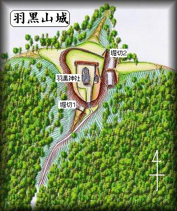 | (以前の記述)羽黒山城は、国道349号線の「生田」というバス停の東北500mにある。比高50mほどの独立した山で、山頂には羽黒山神社がある。また、南側には小川が流れている。 下の鳥居から羽黒山神社の急坂を登っていく。この道は切通のような道であるが、人工的に削り取ったものというよりは、長年、雨水の流れに削られて低くなったものという感じである。途中までは両脇の斜面も緩やかで、あまり城址という感じはしない。しかし、山頂部近くになると、急に両脇が削り立てたような斜面になってくる。この辺りからが城域といえるだろうか。堀切等はないが、大きな石がごろごろと転がっている。あるいはこれは石垣の名残かもしれない。この辺りに城門があったのではないかと思われる。 そこをさらに進むと、神社の一段下の郭に出る。鳥居の西側には写真の堀切がある。現在は鳥居の先の石段から本殿に上がるようになっているが、かつては、写真左手の土手の上を通るようになっていたのではないだろうか。というのも、この堀切の中央部は少し削り残され、土橋のようになっているからである。 一段高い主郭部に本殿がある。20m×30mほどの広さである。本殿の周囲には土塁がある。高さは内側から1.5m、外側では1mほどと、内側の方が低くなっているが、これは神社を建設するときに、平坦部を作るため内側を削ったためであると思われる。 神社の奥(東側)は急斜面になり、6mほど下に腰曲輪のような人工的な平坦部が2段に見える。このような造作から見ると戦国期の城址といってよさそうだ。山中には探せばさらに郭や堀切などがあるかもしれないが、まだ下草が多い時期なので今回はここまで。 城主等未詳だが、戦国期の岩城貞隆との関係が考えられるだろう。 |