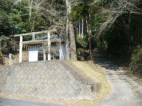 「里美大橋入口」から国道を300mほど北上すると、道路のすぐ脇に神社の鳥居が建っているのが見える。上深荻地区の鎮守である白羽神社である。そこから山の中に入っていく道が見えている。どうやら山林作業用の道であるらしい。