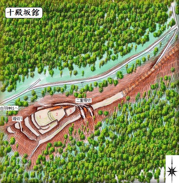 国道349号線と県道36号線とが合流する「里美大橋入口」の交差点からすぐ北側に見える比高70mほどの山が十殿坂館の跡である。十殿坂とは珍しい地名で、何かのいわれがありそうだが、残念ながらそれは分からない。