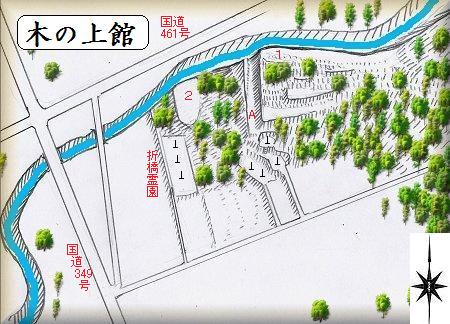 | (以前の記述)木の上館は、国道349号線と国道461号線が交差する折橋の交差点の東南にある比高20mほどの、周囲の山より一段低い台地上にあった。台地の手前には、写真の比高5mほどの平坦地もある。この辺りにも居館的な建物があったのかもしれない。この平坦地の手前は、写真中央部にわずかに見えるが、一段低い水田面となっており、これが水堀の跡のように見える。また北側には横川が流れ、天然の堀となっている。城主等未詳。 | |