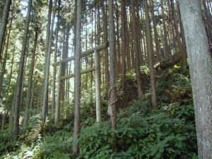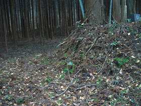 | 1郭の東南角には何かの祠が祭られている。 | 1郭西側の城塁を下の腰曲輪から見たところ。城塁の高さは3mほどである。 |