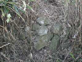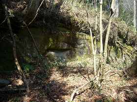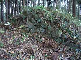 | 主郭西側の石垣。これほどまとまったものは茨城の中世城郭ではまれである。 | Cの櫓台の基部にある石垣の名残。 |