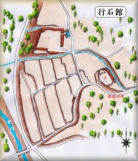 国道349号線(棚倉街道)を北上していくと、「小妻馬場」といったバス停のところで、県道245号線と合流する。この県道にしたがって里川を渡り、台地を少し登っていった辺りが行石館の跡である。