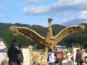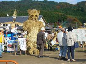 | ちょうど山麓から西に行った所の広場では「かかし祭」をやっていて、大勢の人が来ていた。これは藁で作った鶴。なかなか見事である。 | こちらは直立するアライグマの風太くん。実によくできている。目がなまなましい。これが実物大であったら怖いだろうなあ・・・・。 |