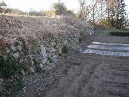 | 矢場から馬場の方を見た所。こうしてみると、土塁が二重になっている様子がよく分かる。 | 表門跡の脇に残る石垣。 |