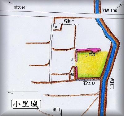 小里城は、国道349号線と県道22号線が交差するところのすぐ東側、里川に望む微高地上にある。ここは里川と薄葉川とが合流する地点であり、平城とはいえ、2つの川に囲まれているため、天然の要害となっている。特に薄葉川に臨む土手は高さ5mほどの断崖となっており、なかなか堅固な印象を受ける。