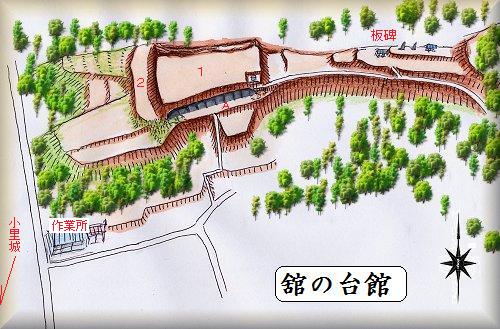 | (以前の記述)舘の台館は、小里城のすぐ東側の独立台地にあった。比高は20mほどで、台地上は平坦地になっている。城主等未詳であるが、すぐ側に、小里城があるので、小里城の戦時用の要害であったかもしれない。とすると、岩城氏との関係が考えられるが、詳しいことは分からない。 | |