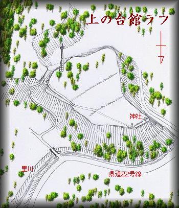 | 〈以前の記述)上の台館は、国道349号線から、県道22号線に入って少し行ったところの南側に聳えている比高30mほどの独立台地上にあった。国道から県道22号線を200mほど東に走ると、里川に架かる橋を渡るが、そのすぐ脇に城址がある。この場所で北から来る川と東から来る川が合流しているが、この里川が北側と東側の堀の役目をも果たしていたようだ。さらに県道を東側に行くと道が左にカーブしている辺りから城址の方に上がっていく道が見える。行ってみたかったが、まだ蛇の出る季節なのでやめておいた。だって蛇こわいもんねー。 城主として中野丹後という者の名が伝えられている。 |