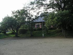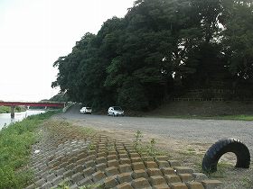 | 五行川の土手から、南側の観音堂の城塁方向を望む。 | 観音堂の本堂脇に残っている土塁。 |